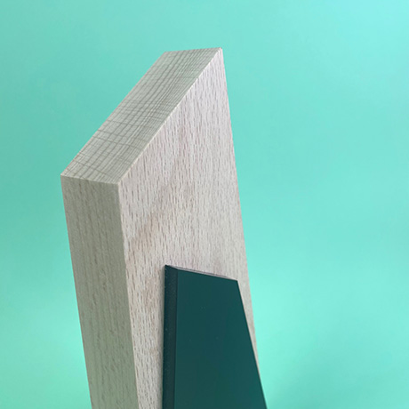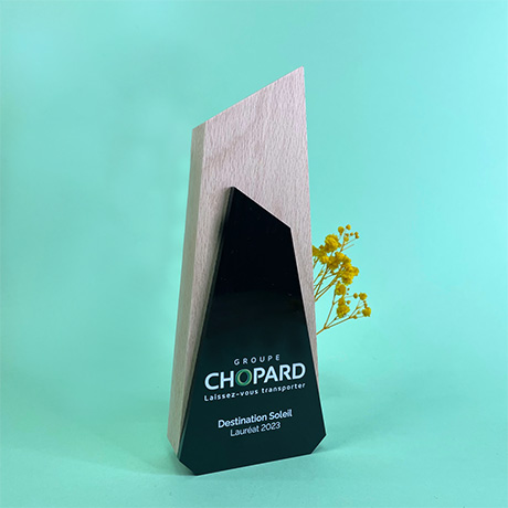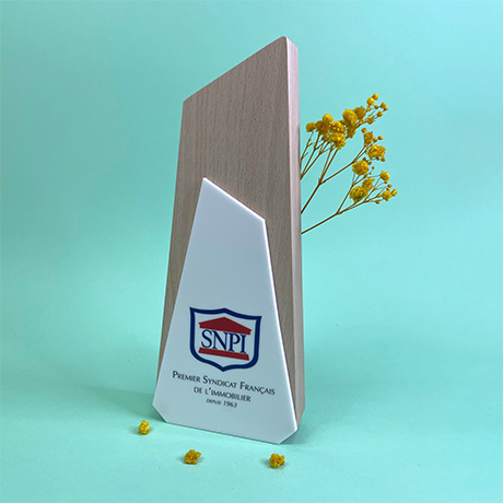 Trophée en bois de hêtre massif labélisé made in France, avec une plaque d’altuglas en superposition (10 coloris au choix). L’altuglas peut être découpé à la forme de votre choix.