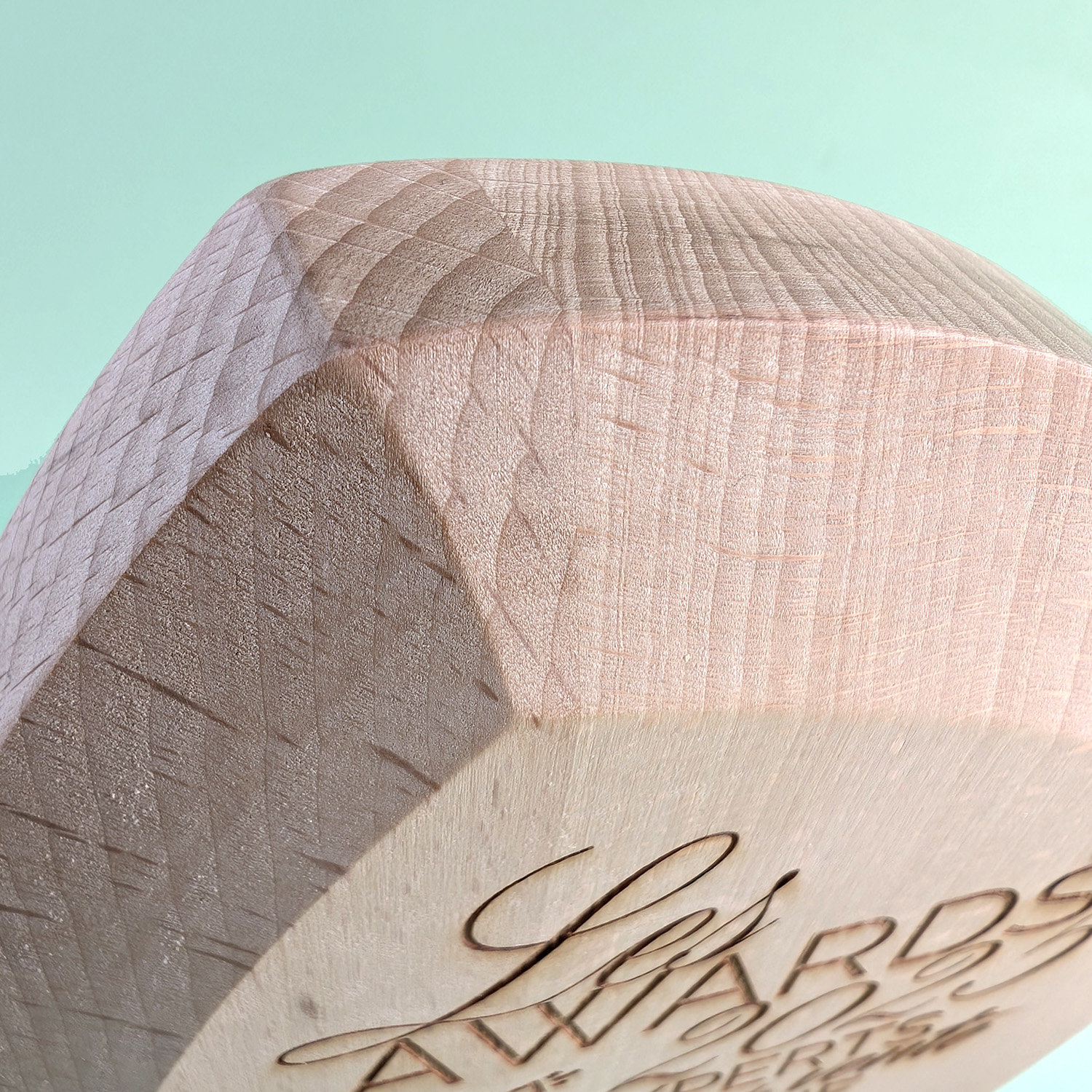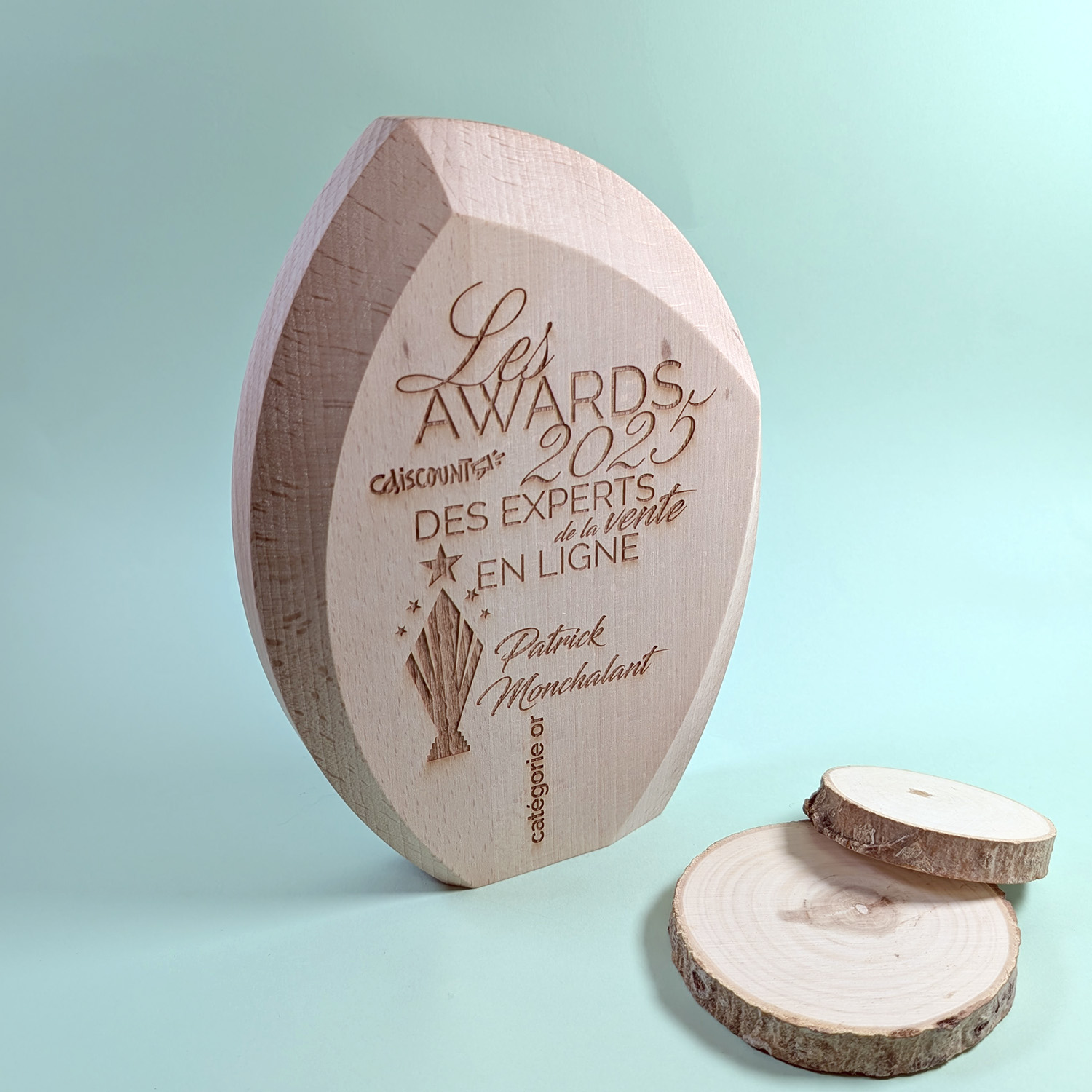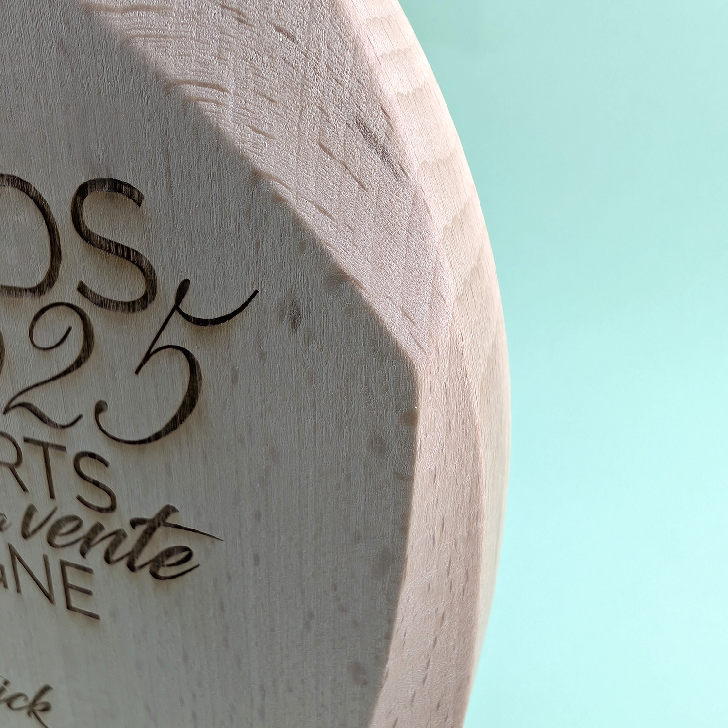Trophée en bois de hêtre massif labélisé made in France avec différents biseautages sur la face avant, ce qui lui confère des formes douces et arrondies.