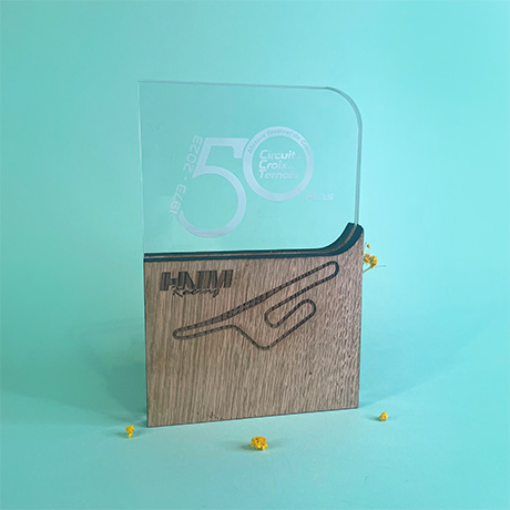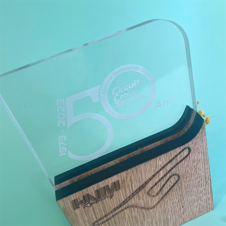 Trophée bloc en bois de hêtre PEFC biseauté avec partie supérieure en plexi recyclé.