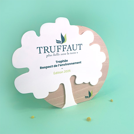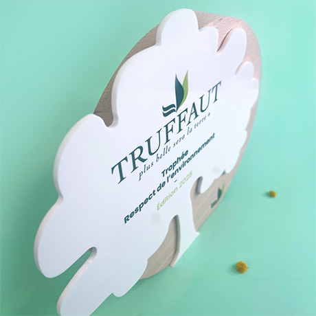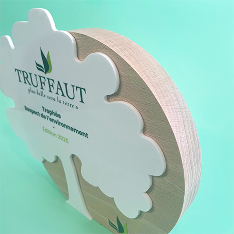 Trophée de forme ronde en bois de hêtre labélisé made in France avec une plaque en Altuglass découpée en forme d’arbre.