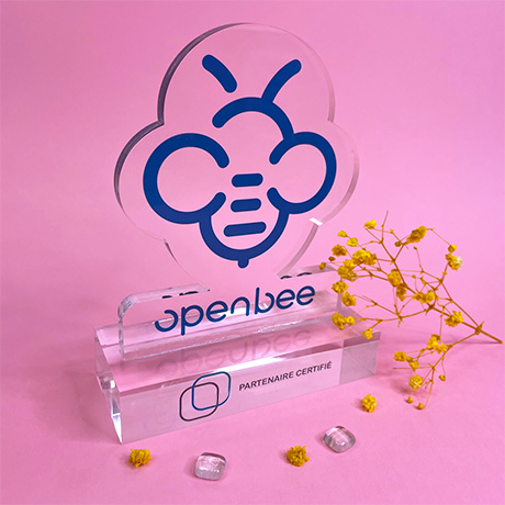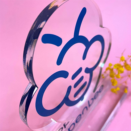 Modèle de trophée sur-mesure en plexiglas transparent découpé à la forme posé sur un socle plexi.