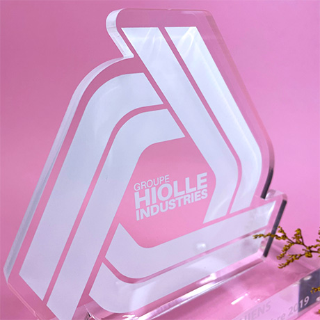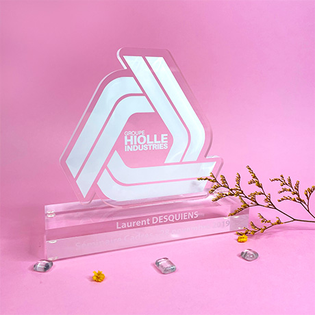 Modèle de trophée sur-mesure reposant un socle transparent, impression numérique sur le corps du trophée en plexi transparent.