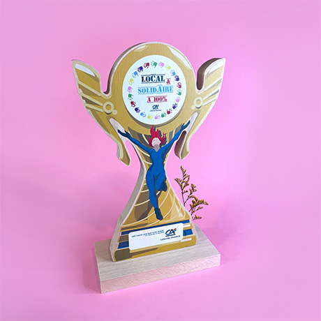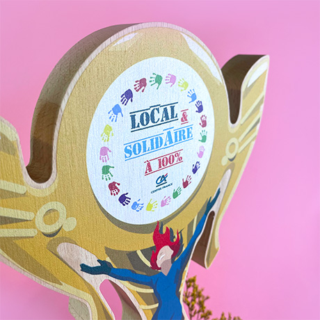 Trophée sur-mesure en bois de hêtre massif labélisé made in France découpé à la forme avec un socle rectangulaire.