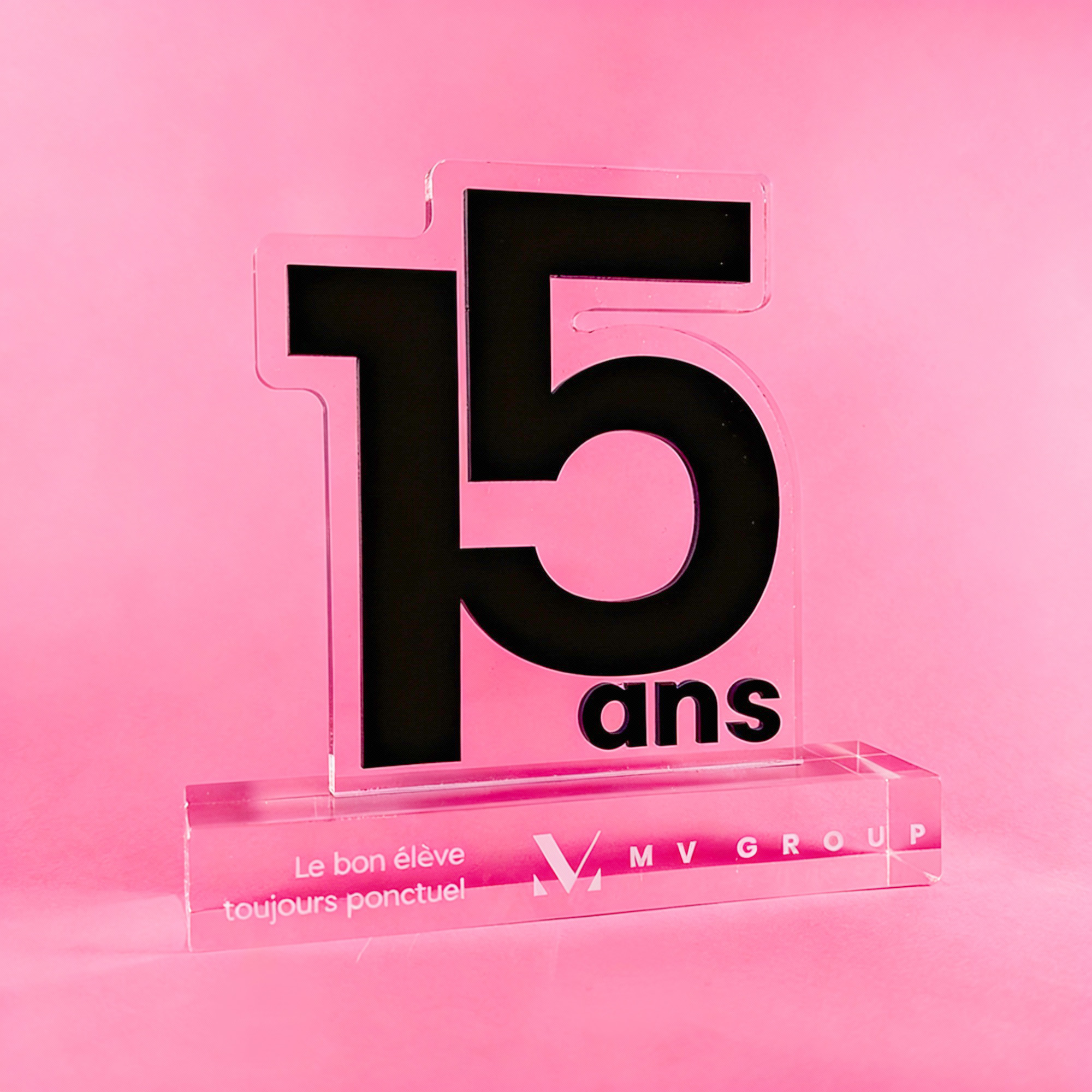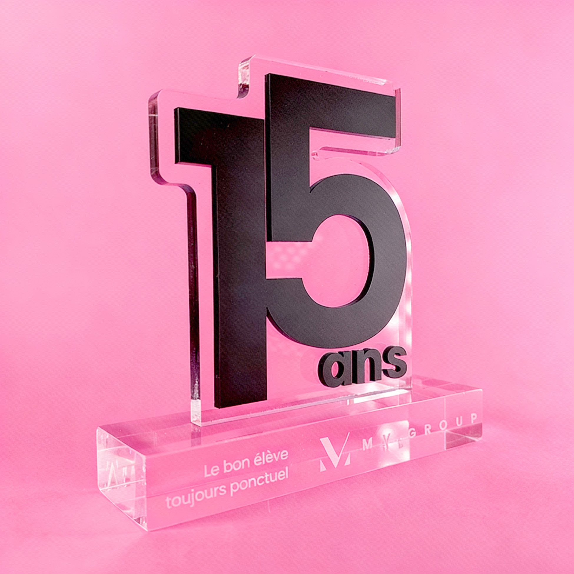 Trophée personnalisable selon un thème, un logo, une idée… Fait d’un assemblage d’une plaque de plexi transparente et d’un Altuglas opaque, le trophée se démarque par des effets de couches d’un rendu flatteur.