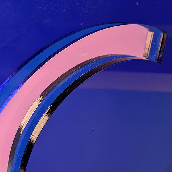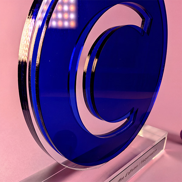 Trophée fait d’un assemblage d’une plaque de plexi transparente et de deux plaques Altuglas translucides bleues découpées au centre. Pose d’une étiquette métallisée et gravée au laser sur le socle.