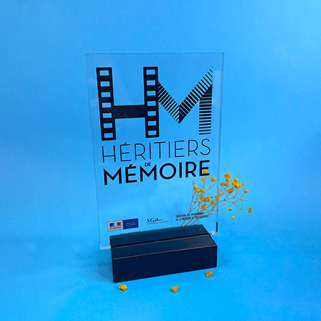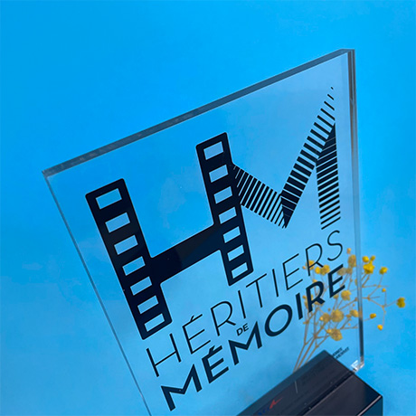 Trophée en plexiglas de forme rectangulaire sur socle en bois noir.