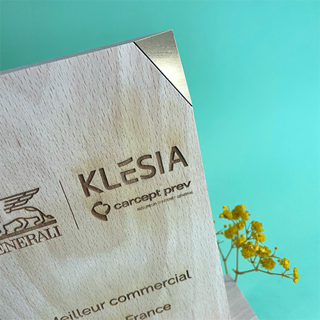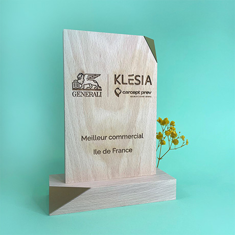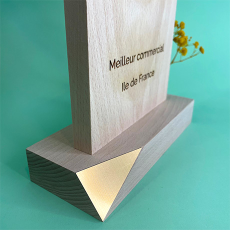 Trophée bloc en bois de hêtre massif issu de forêts françaises certifiées PEFC avec détails en flex doré sur deux coins du trophée.