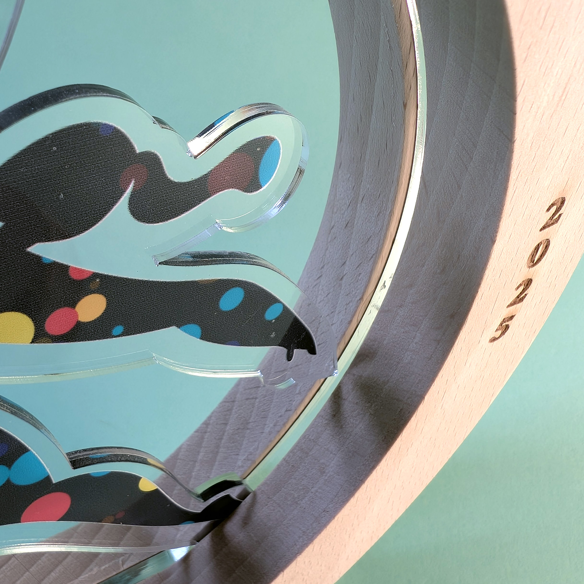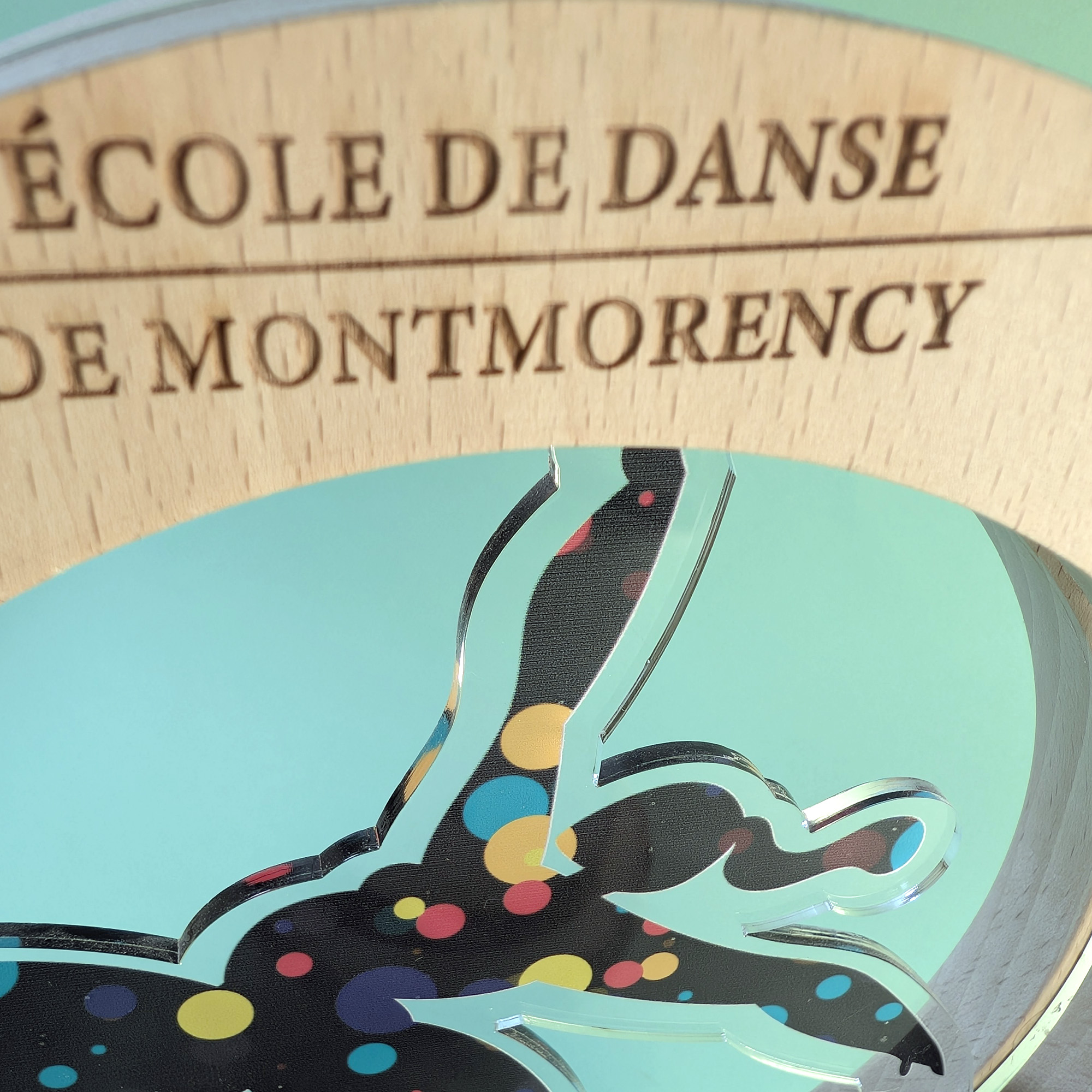Trophée rond en bois labelisé made in France avec la personnalisation de votre choix* sur plaque de plexi. *Découpe de la plaque dans la mesure du possible.