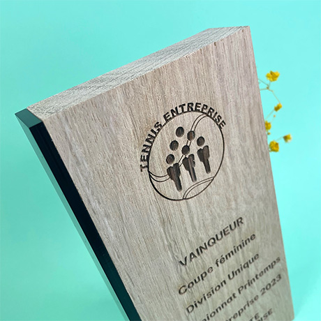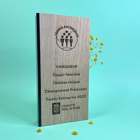 Trophée rectangulaire en bois de hêtre massif labélisé made in France avec détail en altuglas noir sur le côté du trophée.