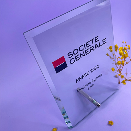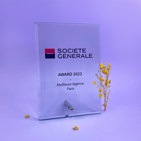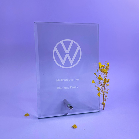 Trophée rectangulaire en verre maintenu verticalement ou horizontalement par un pied en métal.
